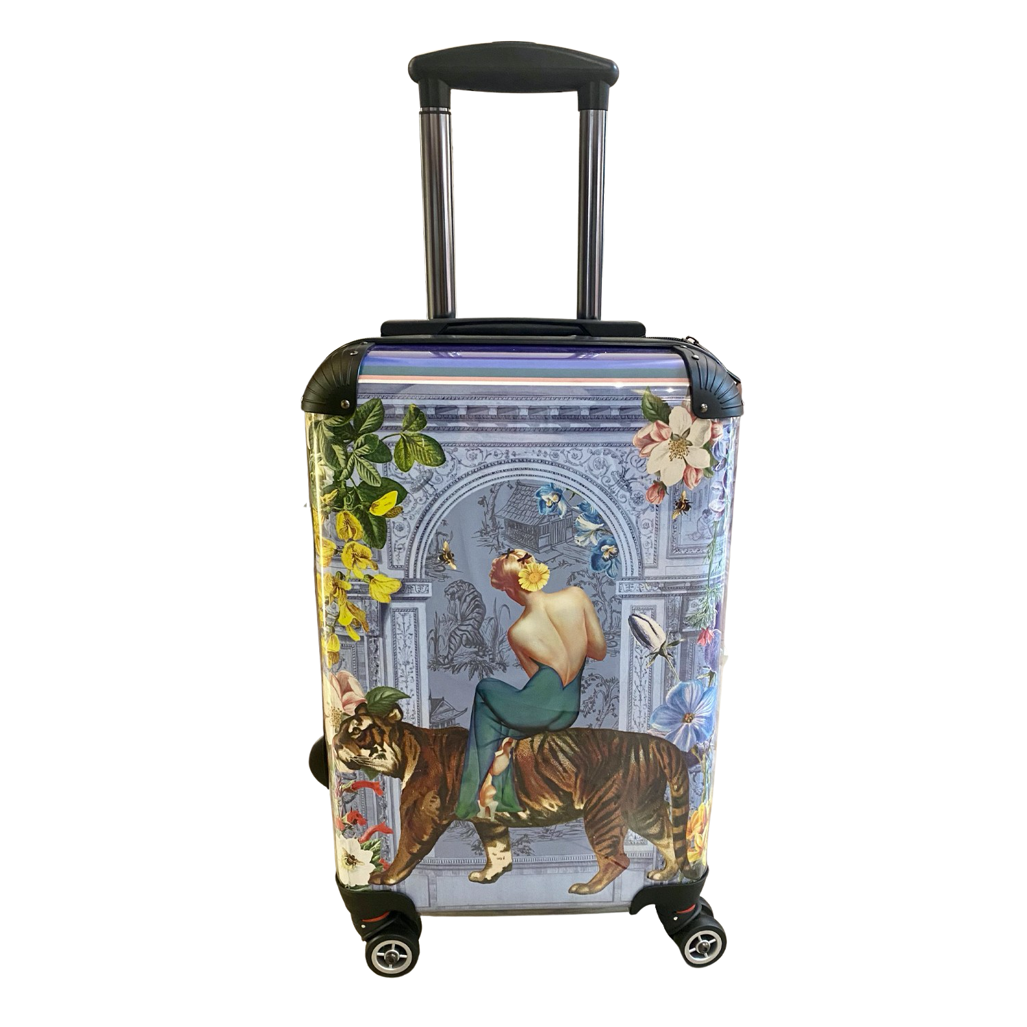 Travel the world in style with your Tigerlily Suitcase - in Periwinkle. She is printed onto 100% poly, 280gsm canvas and put under the Plexiglass front of this sturdy suitcase, in an HD, edge to edge finish. Stash it easily in the overhead compartment, so you don't even need to worry about baggage claim. The soft-grip handle is adjustable, and this combined with the 360° swivel wheels makes it a true joy to use - and look at.