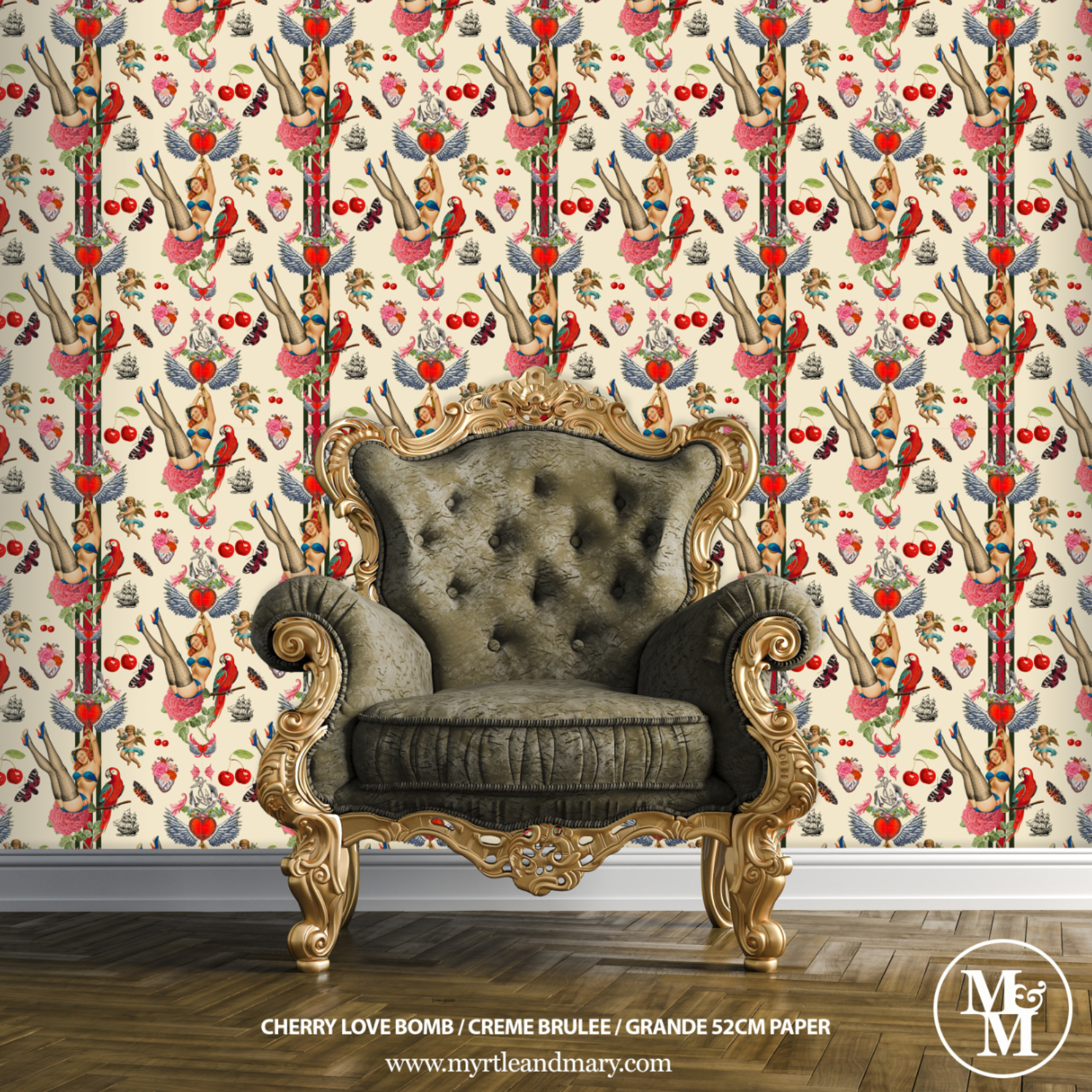 Our made-to-order Cherry Love Bomb Grande Wallpaper 52cm Crème Brûlée luxury wallpapers are printed in eco friendly inks on non woven Toll coated 147gsm paper.